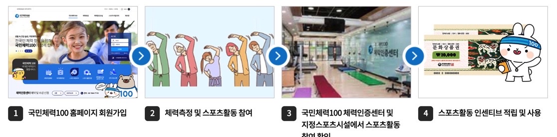 국민체력 100의 다양한 체력관리 서비스와 스포츠활동에 참여 후 적립 기준에 따라 인센티브를